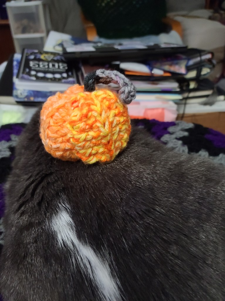 So, my plan is rather than giving him each pumpkin as I finish making them up, I will simply … I think I am going to crochet up a scrappy basket to drop pumpkins in as I finish them up. Why not?