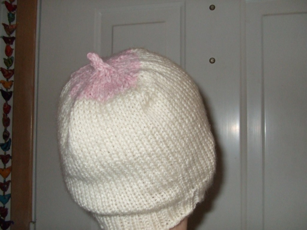 Cut cream color yarn, leaving at least a 6-inch tail to weave in later. Attach blush-colored yarn and continue working decreases.