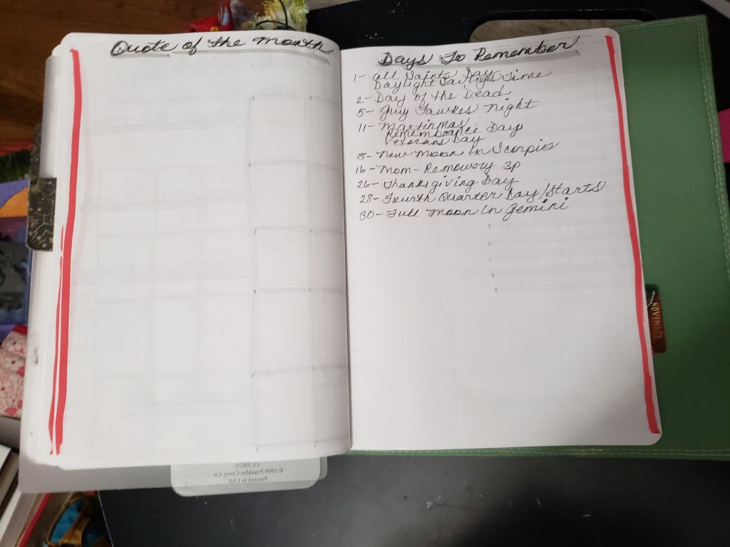 In October, I did not include a monthly spread because in September I had barely used the one I created…by mid-October I felt I needed to have that monthly in my book where I can find it when I need it.