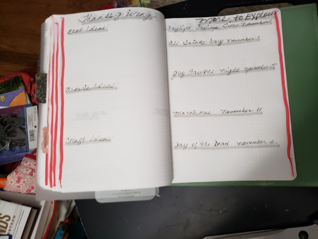 This month I have a page for daily meal plan ideas—because planning a meal for every day isn’t a successful thing for us because sometimes I don’t feel well enough to eat certain things.  Sometimes we go out and eat out without planning to do so.  Instead, I keep a running list of meals to make, or things I want to make for the month.  This month I also have a page dedicated to planning our Thanksgiving meal.