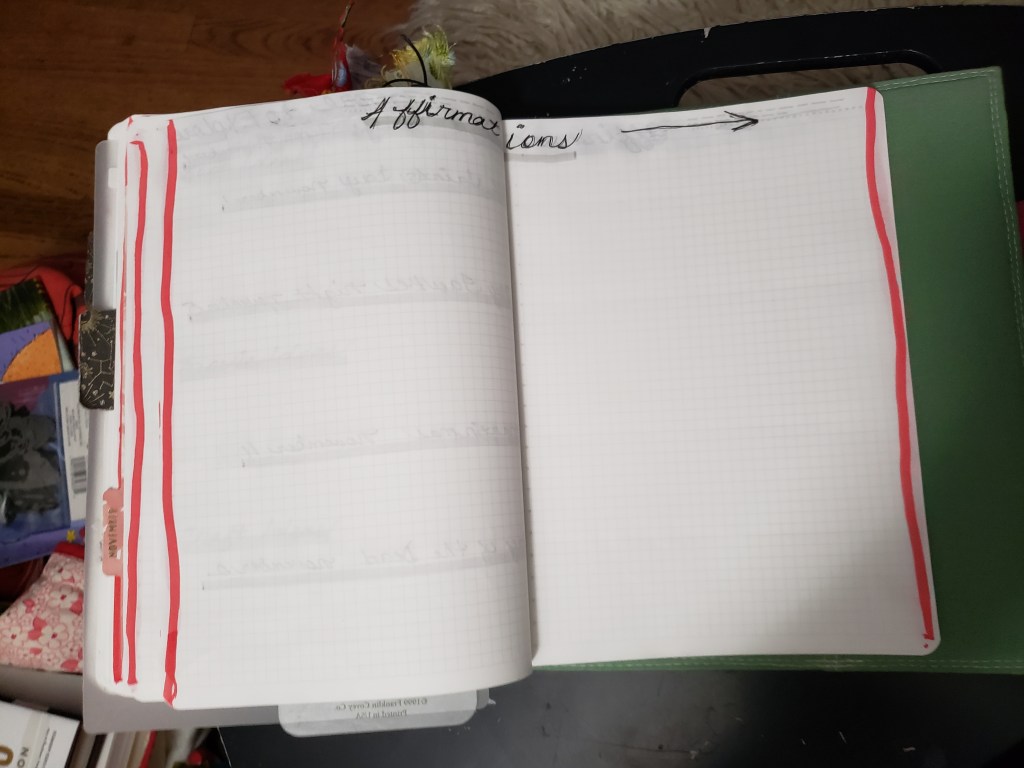 I have four pages set aside for affirmations—I haven’t used it at all actually.  I may need to let this one go.  Usually I take a smaller tip-in card and write an affirmation on it and tip that into the two pages I have set aside for that day, every day.  Well, every day that I feel well enough to do it.