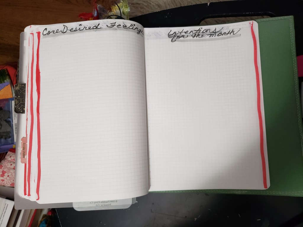 After that, I have a page for my ‘core desired feelings’ for the month…and the next page is for my ‘intentions for the month’.  Any time I forget my why or my what—these two pages are helpful to keep me on track.